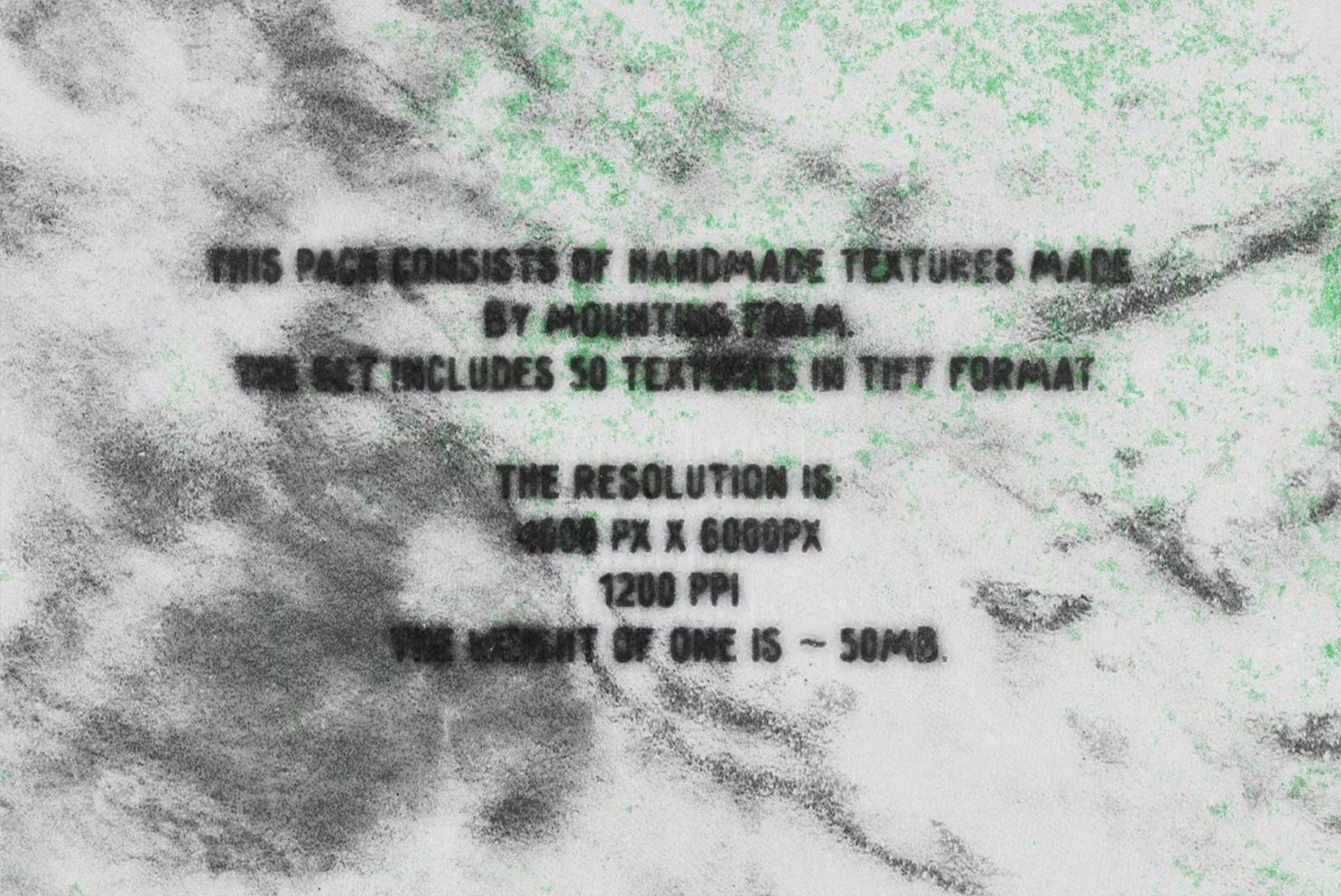 This pack consists of handmade textures made by mounting foam. I spent about a month creating and processing only the material, and I really hope you enjoy these textures. The set includes 50 textures in TIFF format. The resolution is: 4000 px X 6000px; 1200 ppi; the weight of one is ~ 50mb. Perfect for creating music covers and posters.